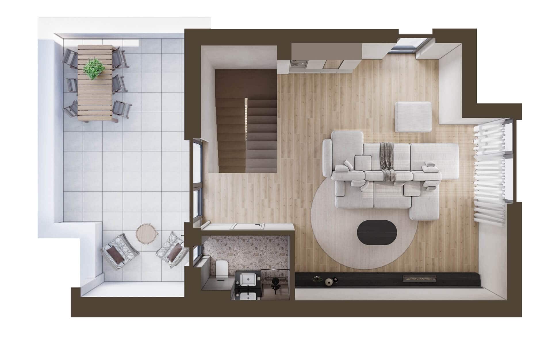 - The terraces are waterproofed with hot-glued bituminous membranes and provided with outdoor ceramic tiles